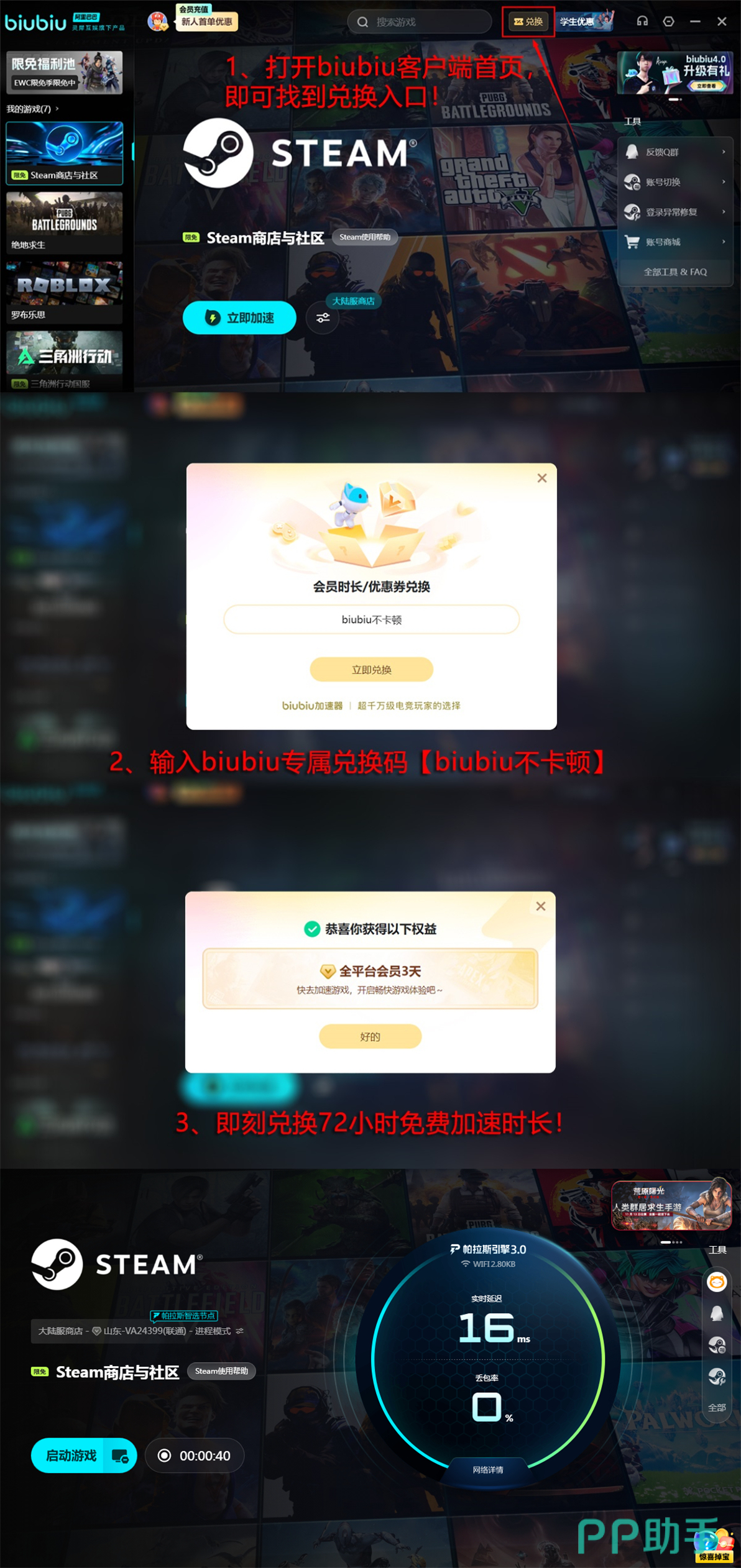 针对新用户,biubiu提供了极具吸引力的试用福利。首先是注册即赠24小时免费加速时长,让玩家第一时间体验优化效果。此外,使用专属兑换码【biubiu不卡顿】还可额外领取72小时加速时间,每个账号限用一次。两项叠加后,新用户最高可获得96小时的免费使用权益,充分满足前期体验需求。