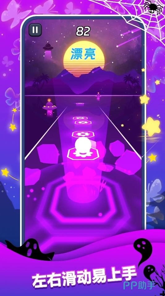 在《节奏跳跃》中,玩家操控一个发光小球,在不同平台之间进行节拍跳跃。小球必须按照音乐节奏起跳,才能准确落在下一个平台上,一旦失误便会掉落结束游戏。前进过程中,既需要观察平台位置变化,也要依靠耳朵捕捉节拍点,实现视听协同操作。这种融合节奏感与时机把控的玩法,带来了独特的沉浸式体验。