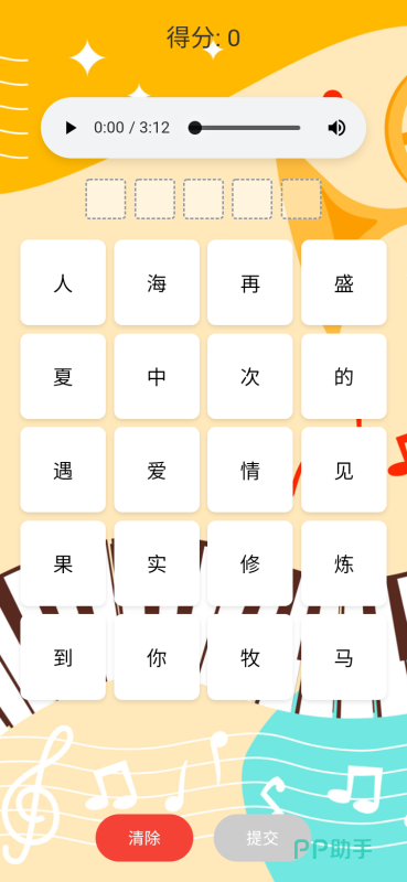 本作主打“猜歌名”玩法,汇集大量流行歌曲片段供玩家辨识。每轮播放一段旋律后,系统会给出若干文字选项,玩家需从中挑选正确词汇填入空格,组合成准确的歌曲名称方可通关。每次正确识别均可累积积分,结束挑战后将显示总得分。规则简单易懂,无需复杂操作,且整体安装包体积较小,非常适合碎片时间娱乐。