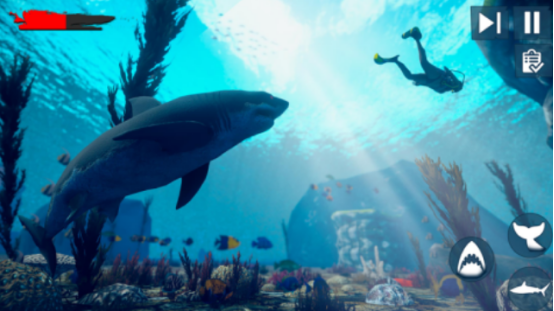 从一条微不足道的小鱼起步,在充满竞争的生态系统中努力求生。通过不断捕食小虾、螃蟹及其他小型鱼类补充能量,逐步扩大体型并解锁更高级别的掠食形态,直至蜕变为令人畏惧的大白鲨。游戏支持单人闯关或多人协作模式,操作界面设有前进、后退等功能按钮,带来沉浸式海洋生存体验。