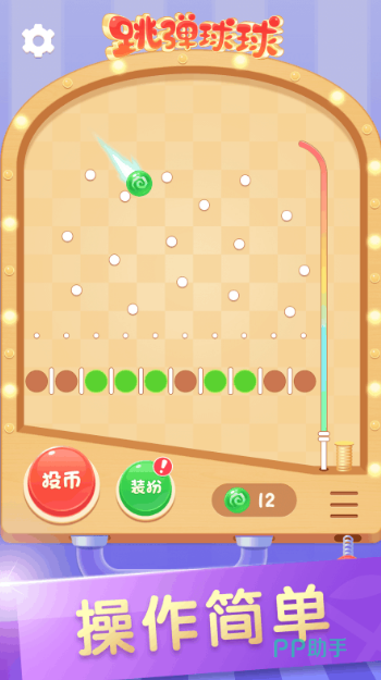 这是一款轻松有趣的弹珠类休闲游戏,玩家控制小球在轨道上进行弹射与跳跃。整体画面色彩明亮清新,目标是将球准确送入指定洞口即可过关。空中设有若干白色障碍球,随机弹跳增加了不确定性因素。玩法模拟现实投币式弹射机理,通关后可获得游戏币奖励,用于解锁个性化装饰内容。