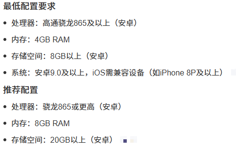 其实小伙伴们只要达到了最低的配置要求,那么就无需担心体验这部作品了,同步搭配适合的提速应用就可以流畅体验。首先,处理器建议骁龙865及以上,内存4gb,储存最少8gb,一般建议大家预留20gb,因为涉及到一些资源更新。至于系统,建议安卓9.0以上。