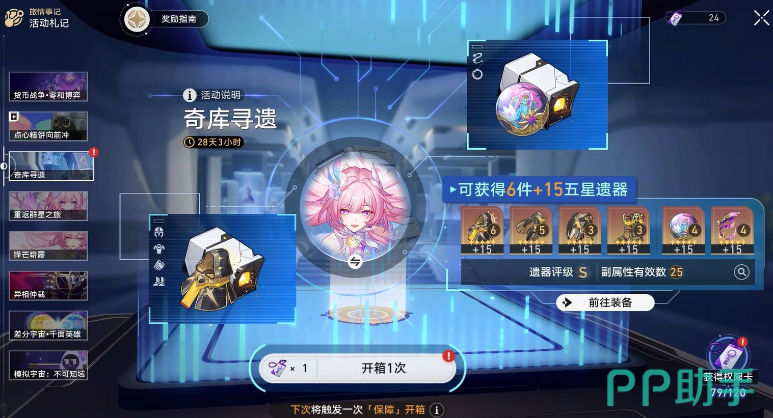 奇库寻迹可在活动页面里找到,进入该玩法后玩家先选择想要进行遗器搭配的角色,再为角色挑选游戏已有的任何一套外圈四件套和内圈两件套,总共六件,随即便能抽取指定套装的加15遗器了。抽取出来的遗器有着随机性,不管是部位还是它们的主副属性都会随机生成,但必定能保证玩家能拿到一套完整的遗器套装。抽取时会消耗权限卡,共有150张,可通过游戏内的各类活动来进行获取,很好拿完,但要注意待150张卡都消耗完后,玩家将无法再进行遗器的抽取。
