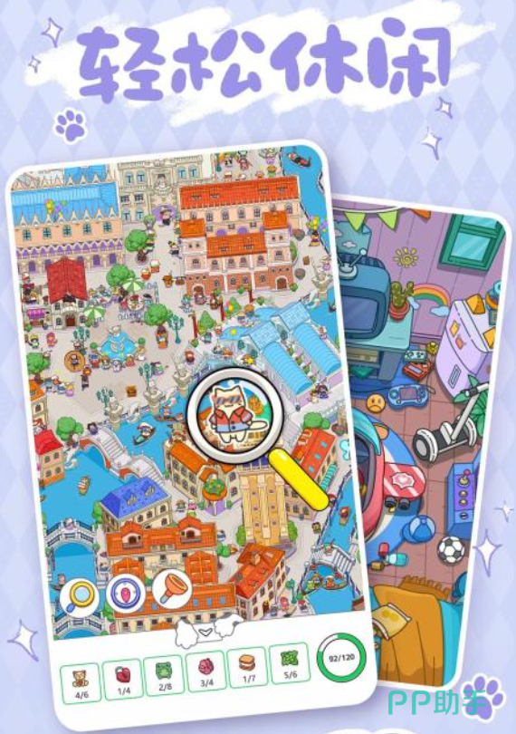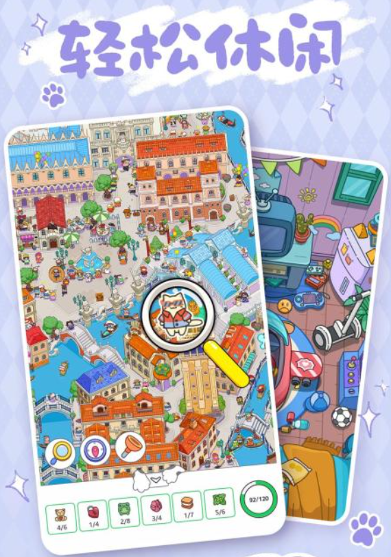 这是一个猫咪主题的找东西游戏,游戏里的场景十分可爱有趣,游戏中的猫猫都被拟人化了,塑造了一个个神奇梦幻的猫猫王国,玩家需要在每一张图中找到任务要求的隐藏内容,画面内容精美而丰富,容易让人眼花缭乱,玩家需要集中注意力,只有找齐所有内容才可以顺利过关,如果对玩法不熟悉也不用担心,关卡难度循序渐进,由易到难,可以让玩家快速上手。