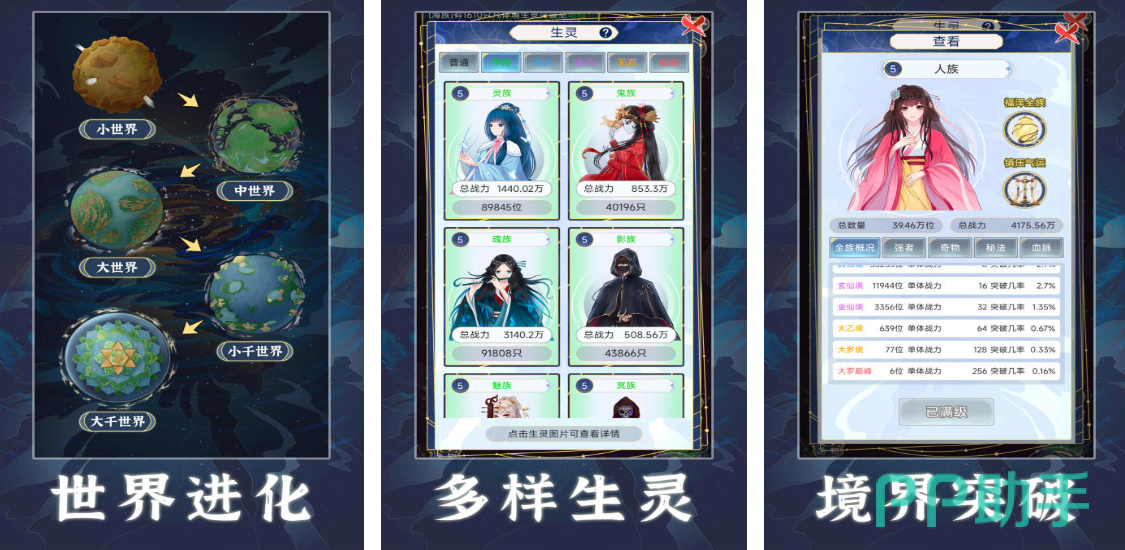 这是一个宇宙宏观主题的养成游戏,在这个天道世界中,玩家可以充当上帝创造各种生灵种族,包括人族、灵族、鬼族等等,还可以利用跃进开启新的空间,还可以通过培养提升自己的世界,去吞噬其他更弱小的世界,让自己的世界不断进化,而有发展就会有冲突,天道世界还会发生很多突发事件,比如种族大战、天灾降临等,用优胜劣汰的自然法则保障世界的安全进化,让玩家体验克苏鲁设定的高端局。