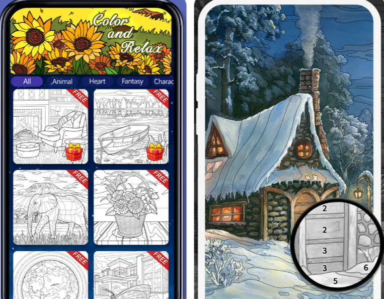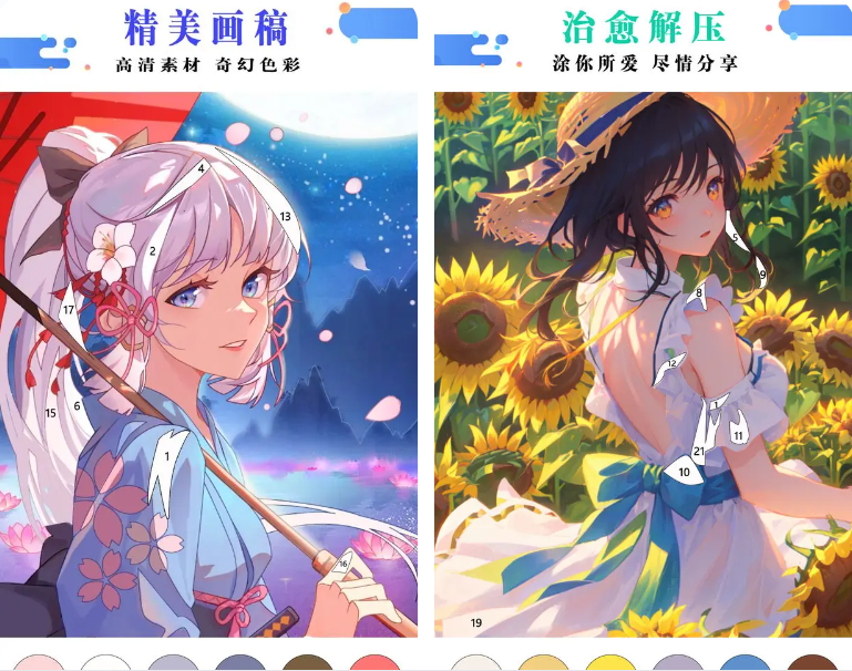 这是一个简单的涂色游戏,只要根据画面上标记的数字涂上对应的颜色,完成画面的整体性就可以过关。游戏里的素材数量非常多,从二次元到风景,从美食到动物,只有你想不到的,没有你找不到的。如果不追求闯关,玩家也可以自由发挥自己涂鸦,也可以按照素材临摹自己喜欢的作品,在现实中提高自己的绘画能力和色彩搭配能力。