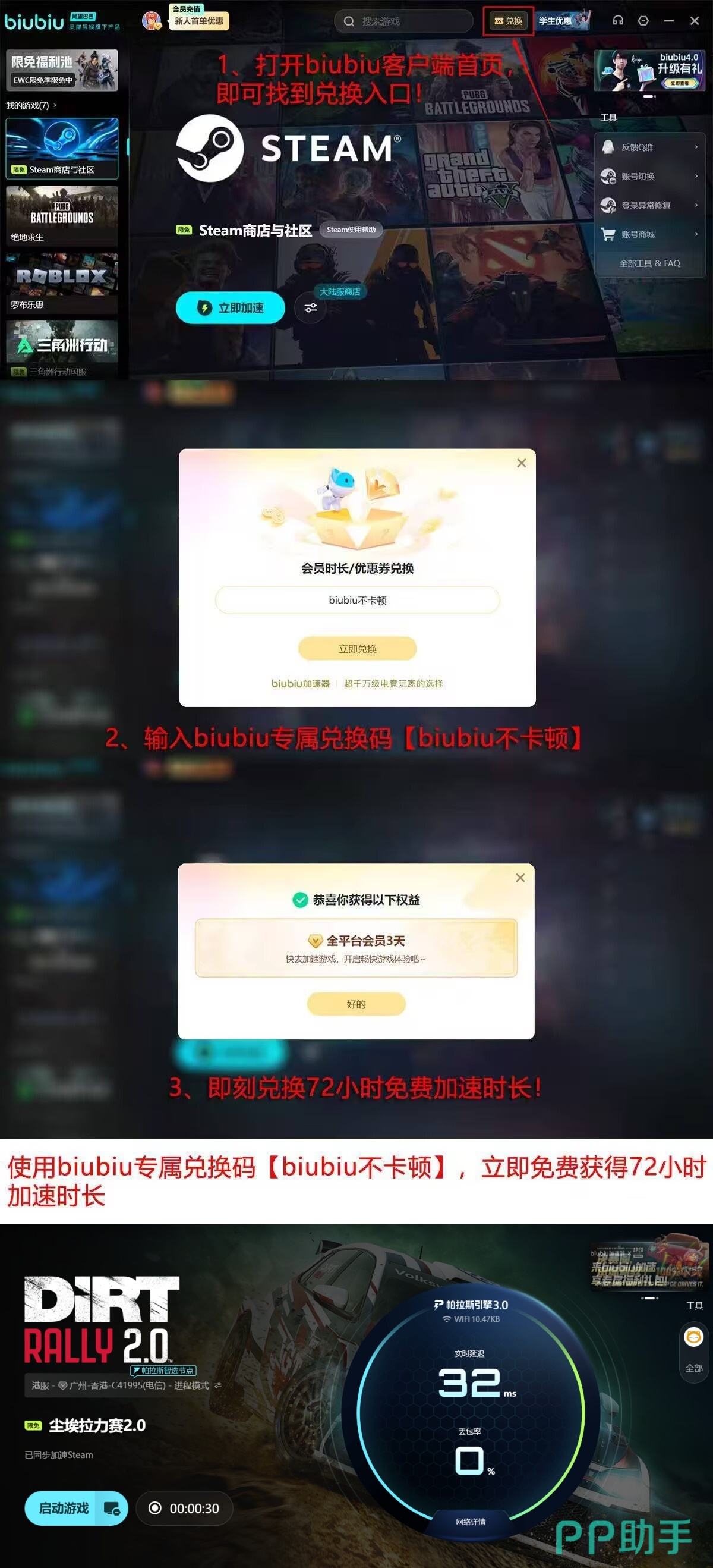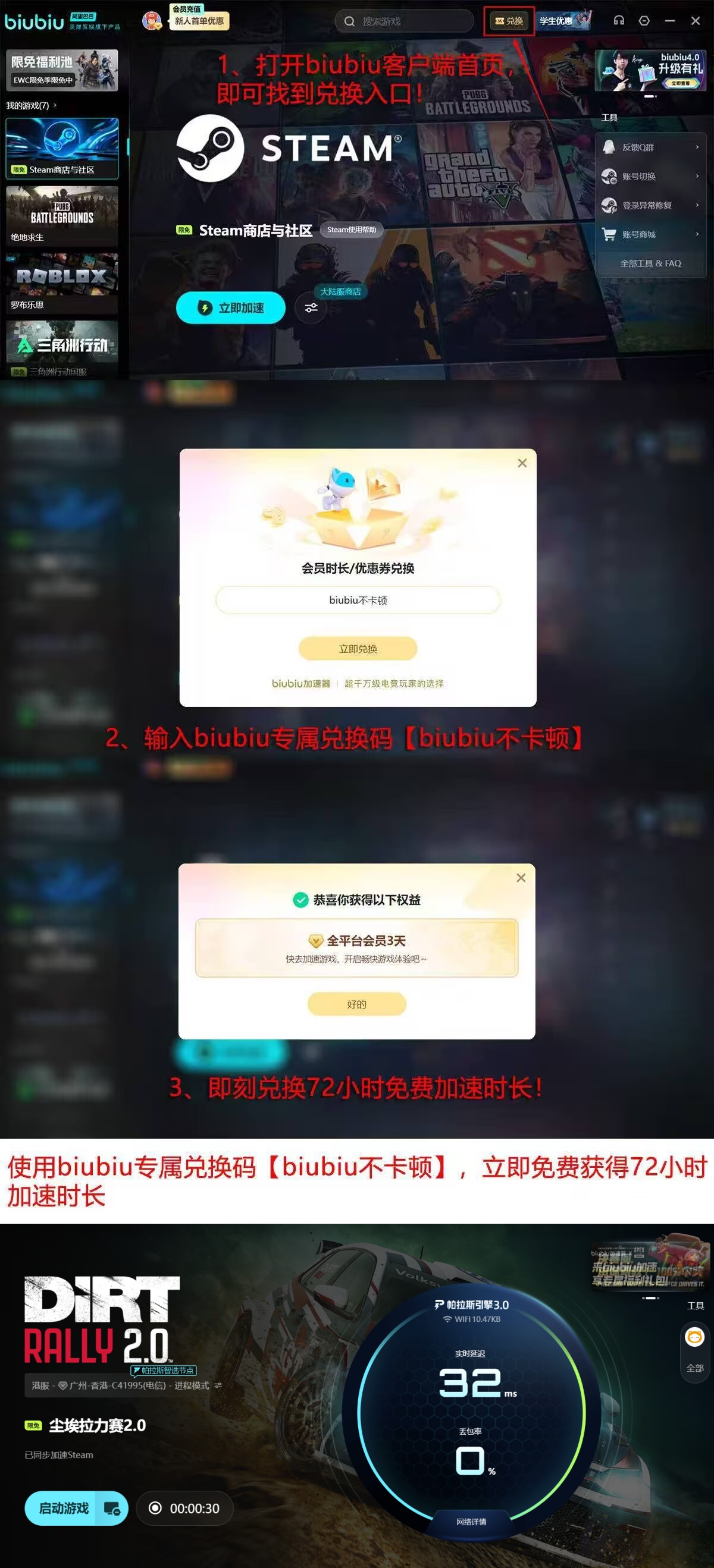 推荐使用文中提到的biubiu加速工具,该软件近期已完成重大版本升级,特别邀请冠军车手左梓轩参与联合调校,并集成全新“帕拉斯引擎3.0”技术,显著提升了网络连接的稳定性和响应速度。针对首次使用的用户,平台提供24小时免费优化时长,注册登录后即可自动获得,无需额外领取。此外,所有用户均可通过输入口令【biubiu不卡顿】兑换72小时的连续加速权益,只需正确输入小写字母组合即可完成兑换。若体验良好,还可选择购买月卡、季卡或年卡,享受多重优惠折扣。
