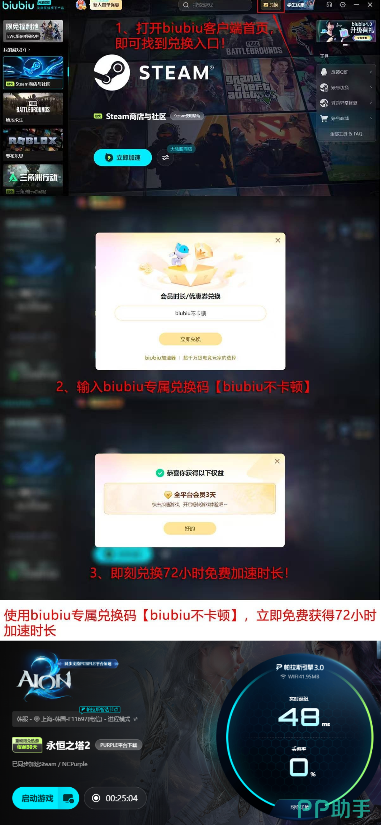 值得一提的是,这款工具不仅适用于当前热门作品,对新上线游戏同样具备良好的兼容性。首次使用的用户将获赠一整天的免费加速时长,充分体验性能表现。更有一项专属福利:只要在指定区域输入兑换码【biubiu不卡顿】,即可额外领取三天使用权限,进一步降低试用门槛。