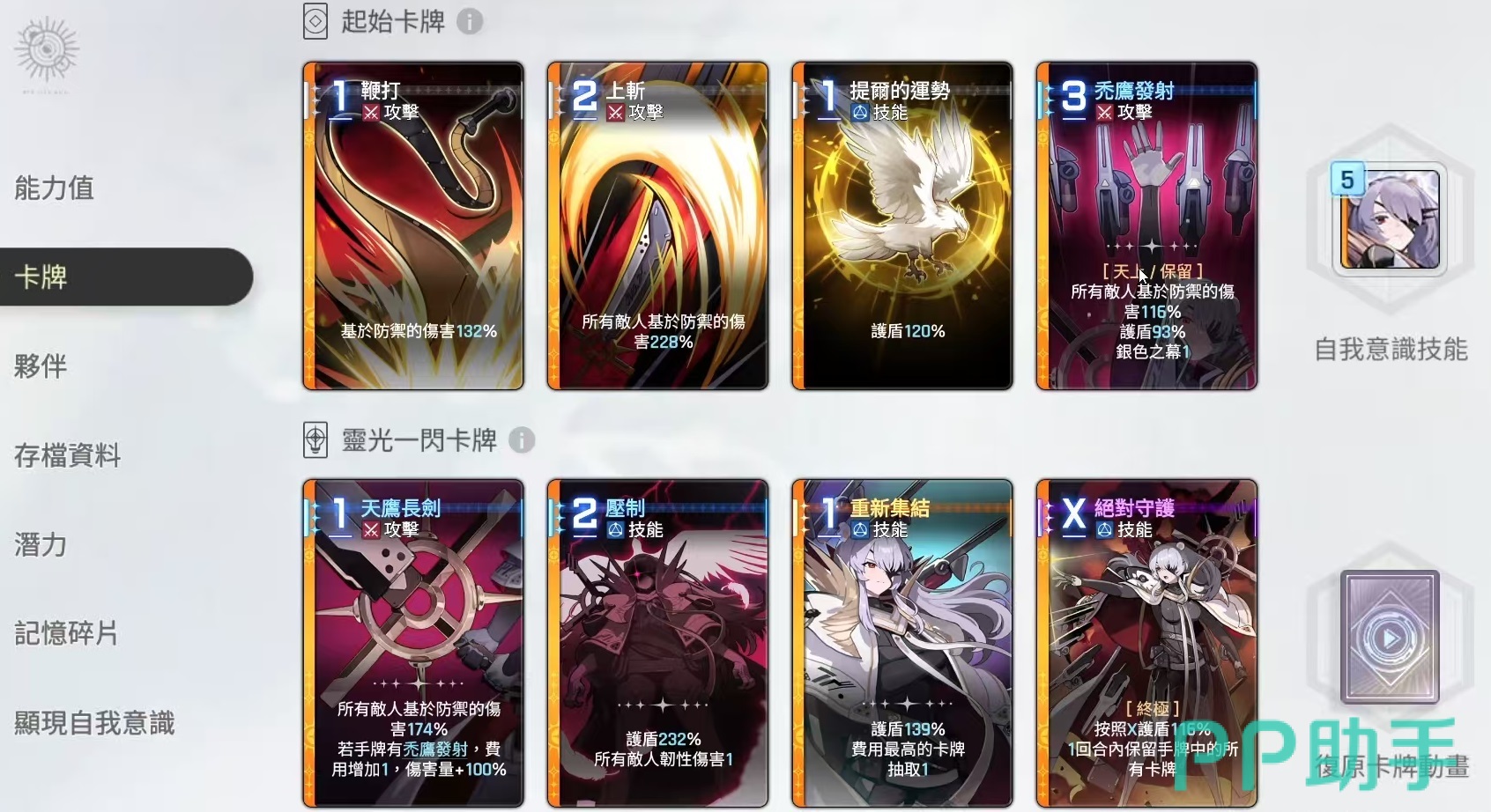 卡利佩的基础技能包含三张关键卡牌:第一张“鞭打”,能够造成等同于自身防御力100%的伤害;第二张“上斩”,可对单体敌人造成防御力180%的高额打击;第三张“提尔的运势”属于功能性技能,使用后可生成相当于防御力100%的护盾,有效提升战场存活率。