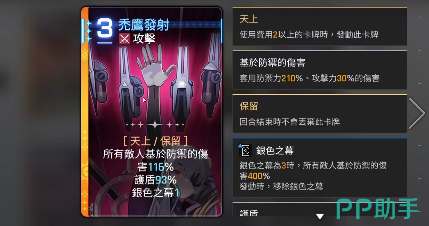 在独特卡牌方面,她的核心机制围绕“秃鹰发射”展开——该技能不仅能对全体敌人造成100%防御值的范围伤害,同时为自己附加80%防御量的护盾,并叠加一层“银色之幕”效果。当“银色之幕”累积至三层时,将触发一次全屏爆发,对所有敌方单位造成高达400%防御值的真实伤害,并清除层数,实现强力清场。