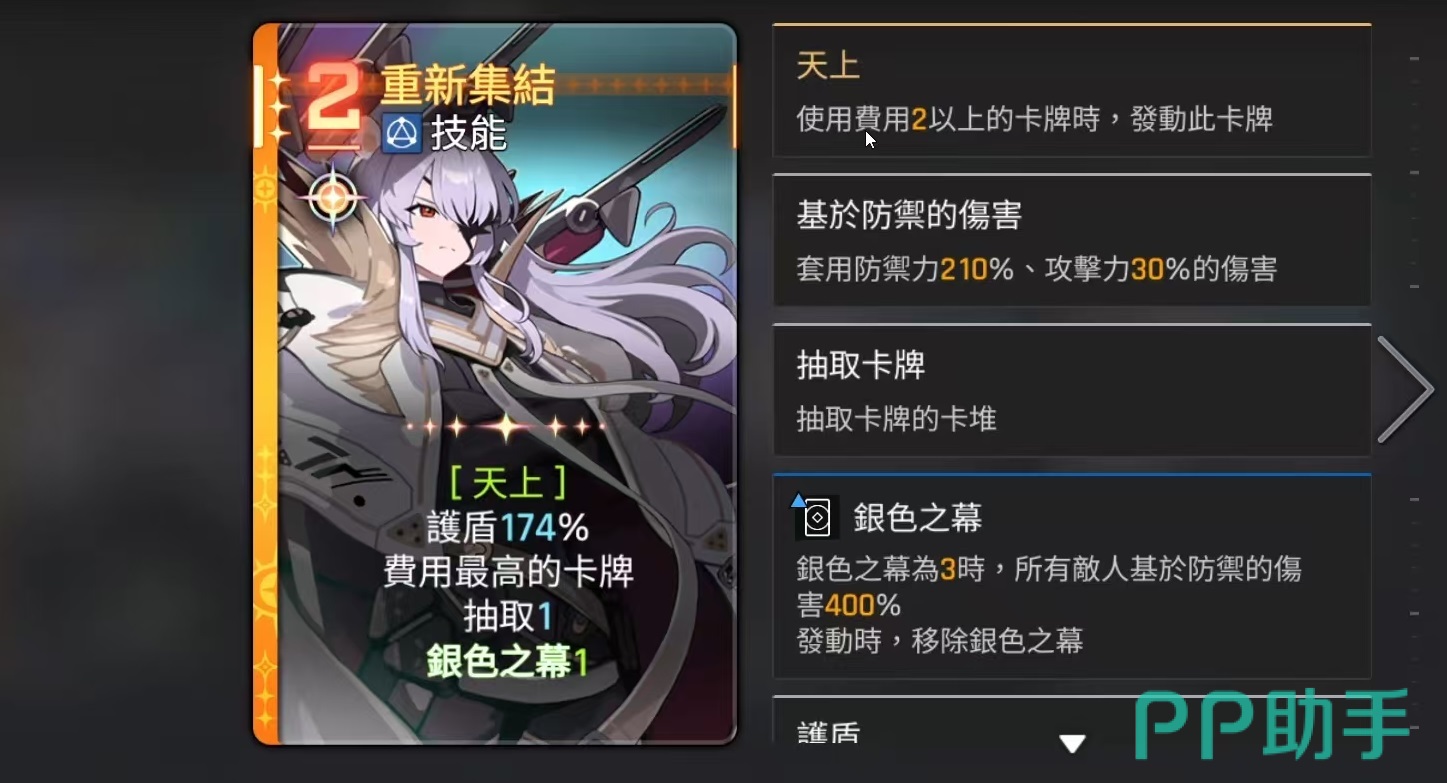 其余独特卡牌包括:“天鹰长剑”,可对全体敌人造成150%防御伤害,若手牌中持有“秃鹰发射”,则此卡费用+1但伤害翻倍至300%,建议优先于“秃鹰发射”打出以最大化收益;“压制”提供200%防御护盾并施加1点韧性削减;“重新集结”可在获得120%护盾的同时,抽取一张最高费用的手牌,增强后续回合调度能力;而“绝对守护”不仅提供高额护盾,还能保留当前所有手牌至下一回合,极大提升了策略灵活性和容错率。