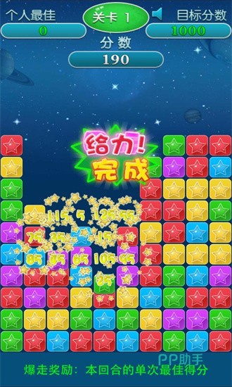 玩法简单直观:只要有两个及以上相同颜色的星星相邻,双击即可消除得分。想要获得更高分数,可通过策略性清除局部区域,使更多同色星星连成大片再一次性消除。分数达标即可通关,并解锁更高难度的挑战关卡。