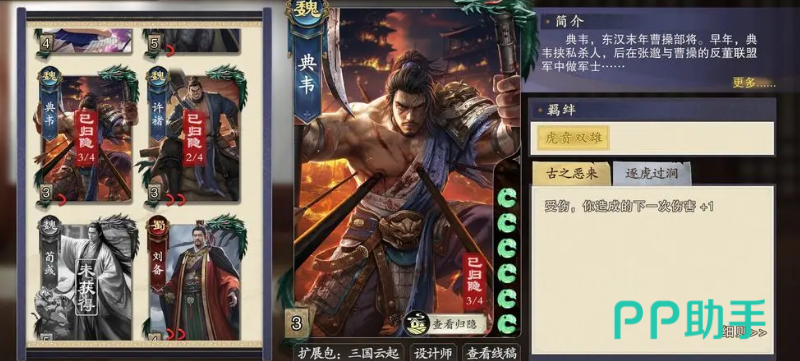 首先推荐的是典韦,他在巨鹿城作为城主时表现尤为突出。当手中持有武器牌时,其实力将大幅提升。“古之恶来”技能可在其受到【杀】造成的伤害后,使下一次造成的伤害+1;而“逐虎过涧”则允许他弃置一张武器牌,并与一名队友交换身份。若目标角色处于距离1以内,对该角色造成伤害时可额外增加1点伤害,这一机制使其在近身压制方面极具威胁。