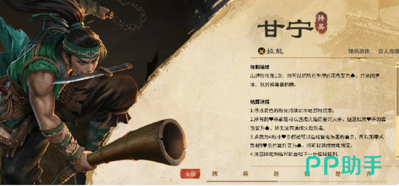 接下来是甘宁,他在兵临城下模式中最适合担任联军角色。其“奇袭”技能要求使用黑桃牌才能发动,成功后可弃置其他角色的一张手牌。由于此技能更利于干扰敌方阵型,在联军阵营中能发挥更大作用,因此不建议将其作为城主使用。但在需要频繁打乱对手节奏的对局中,甘宁无疑是优选之一。