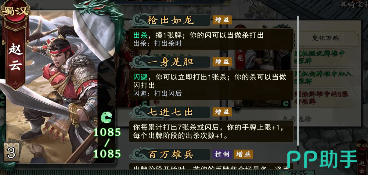 第二位值得信赖的武将是赵云,无论是在徐州还是荆州的城池对抗中,他都能胜任城主职责。“枪出如龙”让他在使用【杀】时额外摸一张牌,且手中的【杀】可视为普通【杀】打出;“以身试胆”则赋予他在使用【闪】后立即打出一张【杀】的能力,且该【杀】也可当作【闪】使用。此外,“七进七出”机制规定:每当累计使用7张【杀】或【闪】后,手牌上限+1,同时每个出牌阶段可多使用一次【杀】,极大增强了持续作战能力。