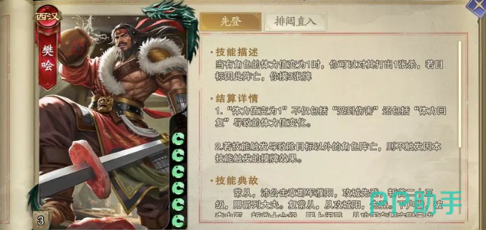 第二位值得重点关注的是樊哙。他的核心优势在于信息掌控与斩杀能力。在一技能发动时,可在回合开始阶段查看攻击范围内所有角色的手牌内容,并强制其只能使用其中一张,其余手牌暂时封锁。此外,当任意角色体力降至1点时,樊哙可立即对其打出一张“杀”,实现精准收割。成功击杀目标后还能额外摸取三张牌,形成滚雪球式的优势扩大,在中后期具有极强的压制力。