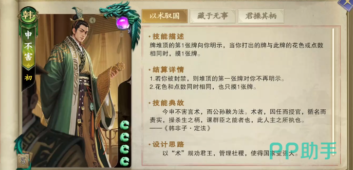 最后一位是擅长信息掌控的控制型武将申不害。其一技能具备预判能力,可查看牌堆顶第一张牌,若打出的卡牌与其花色一致,则可再次摸一张牌,形成连贯操作链,提升出牌流畅度。二技能每局仅限一次,当其成为“杀”或战法类卡牌的目标时,可强制公开对方所有手牌,并持续至该回合结束,令敌方策略完全暴露。这项能力在组队对战中尤为关键,能为全队提供宝贵的情报支持,帮助制定反制策略。
