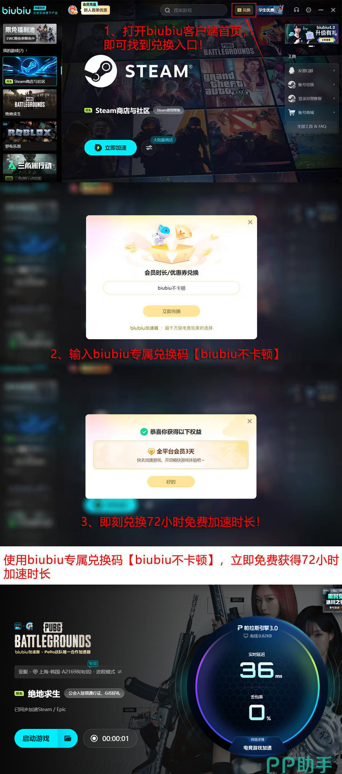 另外大家关心的安装问题,大家只要在点击上方的biubiu游戏加速器就能找到,按照网页上的下载安装流程即可,非常方便。当然安装完之后,biubiu也为首次使用的玩家准备了丰厚的大礼,安装注册完,新人24小时免费加速时长,系统会直接发到新账号上,当然同时,大家还能参加会员口令福利活动,即用【biubiu不卡顿】口令,在加速器首页上就能兑换到72小时福利,这个福利只要是会员都能领取一次,而且新人两个福利时间是可以直接叠加,足足有96小时。另外需要注意的是,福利时间内,整个平台的数千款游戏都可以免费加速,当然国际服游戏下载,一些软件的加速都可以通过biubiu来提速。