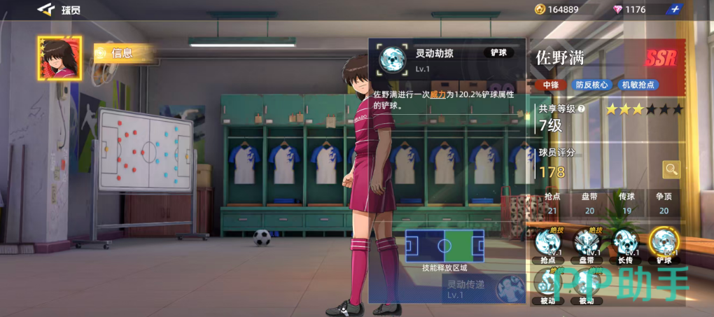 而在目前他作为中锋的情况下,其实长传相比短传的动作,更建议他去用长传的动作,因为他用长传的动作是有一个技能叫做叫巧劲妙传,这个动作就可以为他带来威力120%左右的属性增加效果,有了这样的属性增加,也可以让他的长传动作更好用一些,而额外在铲球的动作上面,他还有一个技能也是可以使用起来的,这个技能叫做灵动劫掠,这个技能在游戏当中会让佐野满带来120%左右的铲球威力效果,那么这个铲球动作达成的区域基本都是在右半场的区域。