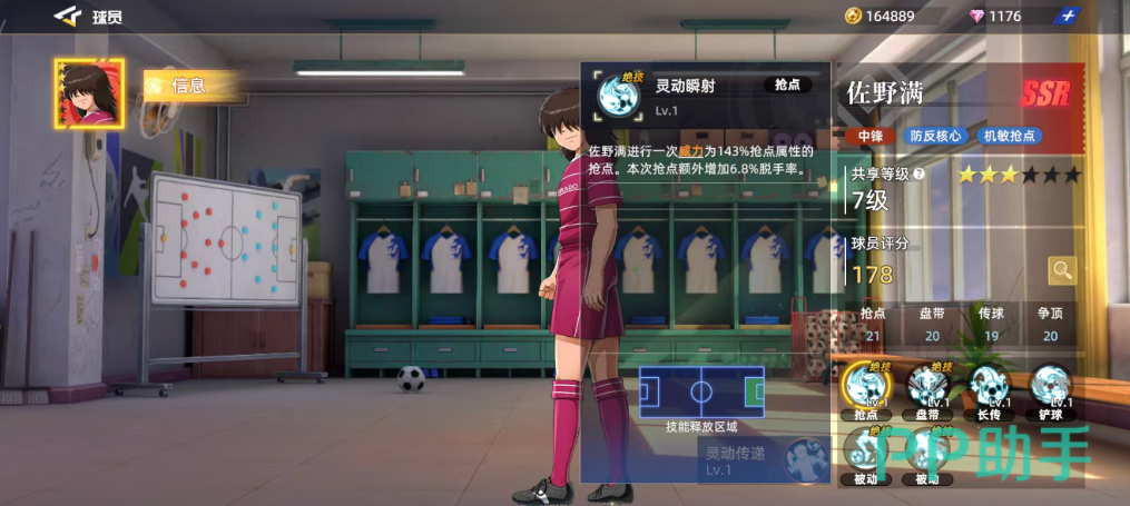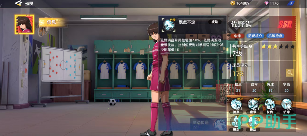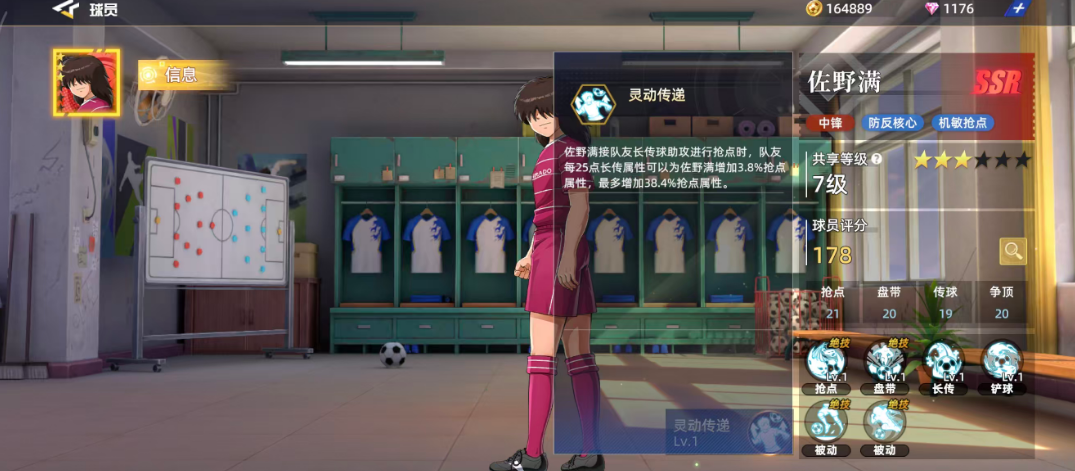 佐野满在达到SSR这个品质之后,他在综合的球员评分上面也有178的评分,这个评分在目前的同类球员当中分数也是比较高的,而且他的抢点分值也达到了21分,这样的一个评分,代表他在抢点的动作上面确实是比较有优势的,其余在盘带的技术5分之上面也达到了20分,而传球的技术得分只有19分,争顶的得分达到20分的话,就说明他在目前这几个属性的效果上面都是比较均衡的,而这个球员在综合的评价六维图当中,其实整体在进攻能力上面虽然比较一般,但是他的预判以及整体效果上面都是有不错的功能数值可以利用起来。