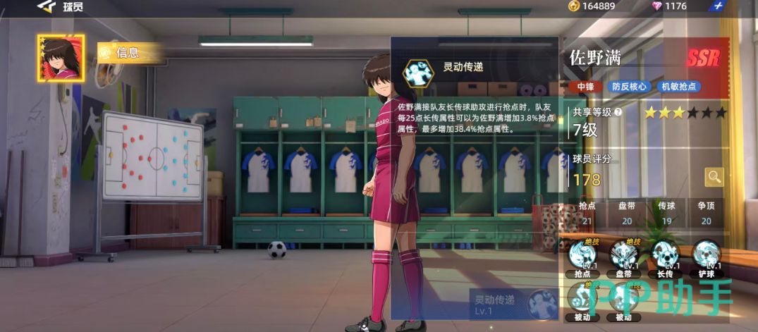 他在最后一个技能上面还有一个灵动传递的技能,这个技能是根据他接到队友的长传球时就可以进行抢点,所以在此时有队友助攻的情况下,他就可以带来25点的长传属性,可以给佐野满带来的抢点属性增加达到了3.8%的效果,当然最多的情况下,这里的数值也可以提升到38.4%。