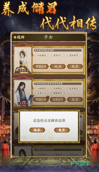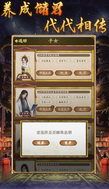 玩家作为神州大地的主人,不仅要处理各种朝政和奏折,也要对各种外交与军事做出决定。游戏把皇帝职能巧妙的分为几个阶段,可以发动战争和签订盟约,让民心和士气获得稳定的发展,通过开疆扩土规划税收政策,增强经济实力。玩家需要付出精力让臣子的能力逐渐提升,后宫的嫔妃同样会出谋划策,让玩家的事业更上一层楼。
