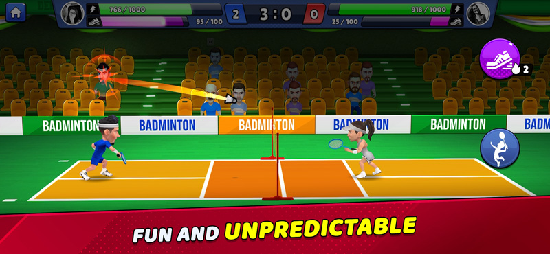 手指在屏幕之间的滑动,就能够完成对击球各种动作的轻松控制,向上滑动屏幕便可做出吊球的操作,而向下滑动屏幕则可以进行扣球。玩家熟悉了这些操作之后,在各种对战模式中都能够赢得很好的成绩。支持单人对打和双人对打两种基础的模式,在两个人同时上场比赛时是很考验队友之间的默契度的。由于羽毛球在空中移动时会受到阻力和风速的各种影响,玩家也要及时的调整自己在打球时的力度和方向。