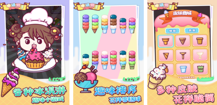很多人体验游戏就是为了能够休闲解压,冰淇淋,雪糕工厂排序就是一个非常解压的竖屏游戏,挑战开启之后会有大量的冰淇淋,每一个上面都会有不同口味的冰淇淋球,玩家需要在规定的时间内,按照不同的颜色分类,每次挑战这些冰淇淋球的顺序都不一样,另外这些冰淇淋脆筒也支持皮肤更换,可以来游戏里通过点击的方式,完成这些冰淇淋的排序。