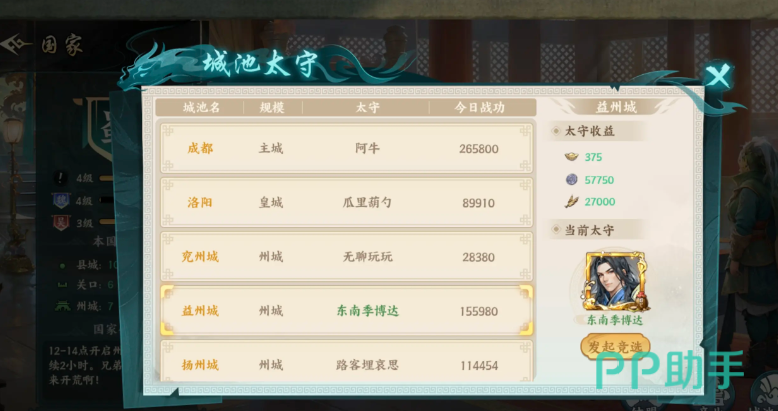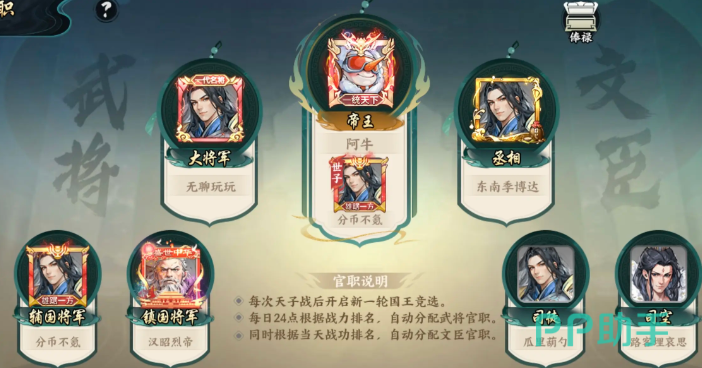 值得一提的是,官职系统也会对战功产出带来额外加成。系统会依据全天24小时内的战功排行定期分配职位权限。其中太守竞选活动开放时间为每日12:00至14:00,若当前战功排名靠前,则有机会参与角逐,成功当选后将获得包含武功秘籍在内的多种稀有奖励。因此建议日常保持一定频率的战功刷取节奏,以提升入选几率。