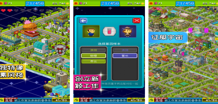 宇宙探险物语以像素风格演绎外星开拓主题,可以通过模拟经营的方式建设自己的宇宙基地,玩家作为星球开拓者,需规划地形布局,依次建造道路、观光设施等建筑,通过规划设施位置可以提升生产效率与观光价值,玩家可通过行星邀请吸引外星住民定居,居民等级提升后房屋会自动升级为高科技样式,同时解锁更多技能。