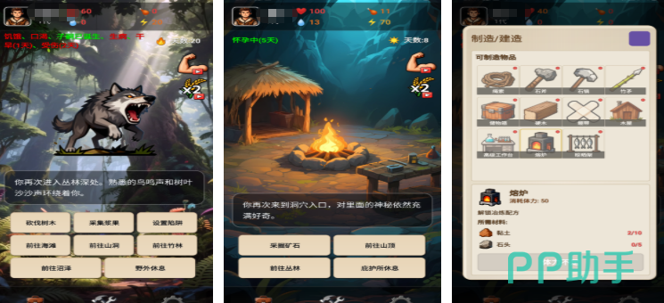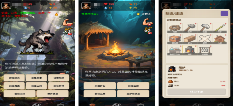 愚公海岛生存以文字冒险呈现,玩家需要扮演一个远古的人类,通过努力建造船只逃离海岛,独特的世代传承机制打破传统生存游戏局限,在探索的时候可以深入到丛林和沼泽各种复杂地形中去,利用环境进行资源的获取,同时根据野兽习性布置陷阱或主动追击获取食物。