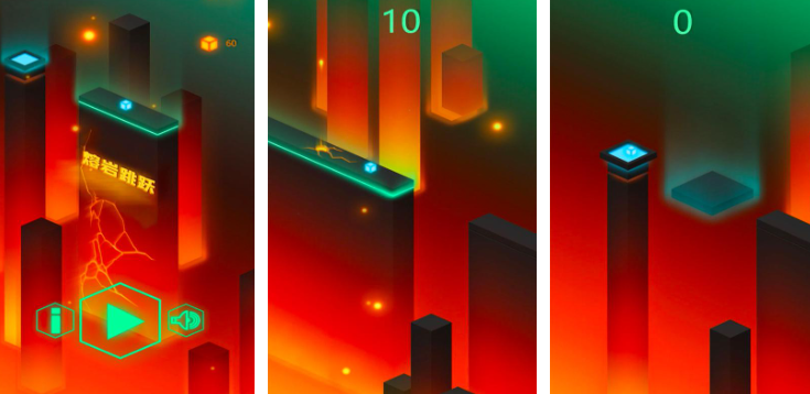 熔岩跳跃以火山场景为背景,玩家通过点击屏幕控制角色起跳,长按可调整跳跃力度与距离,需要在各种不一样的背景平台中进行跳跃,避开下方沸腾的熔岩与飞溅的火山碎屑,平台系统具备动态特性,部分随时间下沉或横向移动,部分则存在踩踏后碎裂的风险,需预判其状态变化选择起跳时机。