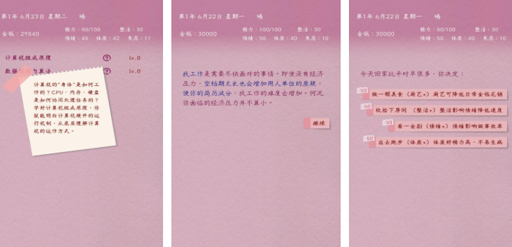 英子的失业日记以文字模拟为呈现形式,主角为来自偏远山区的女程序员,玩家需帮助其寻找新出路,角色属性系统涵盖精力、体质等多个维度,日常活动会消耗对应属性,如熬夜投简历会降低体质,长时间不整理房间会影响整洁度,需合理分配时间平衡求职、休息与生活事务。