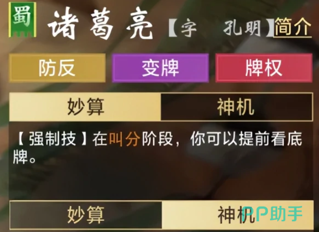 接下来介绍诸葛亮,作为高难度操作代表,他适合对游戏节奏有深刻理解的进阶玩家。他的“妙算”技能可在叫分阶段揭示底牌内容,为后续策略布局提供关键信息。“神机”技能则允许玩家将手中大于K的牌转换为当前数量最多的一种牌型,有助于快速构建强力组合,提升出牌效率,在关键时刻扭转局势。