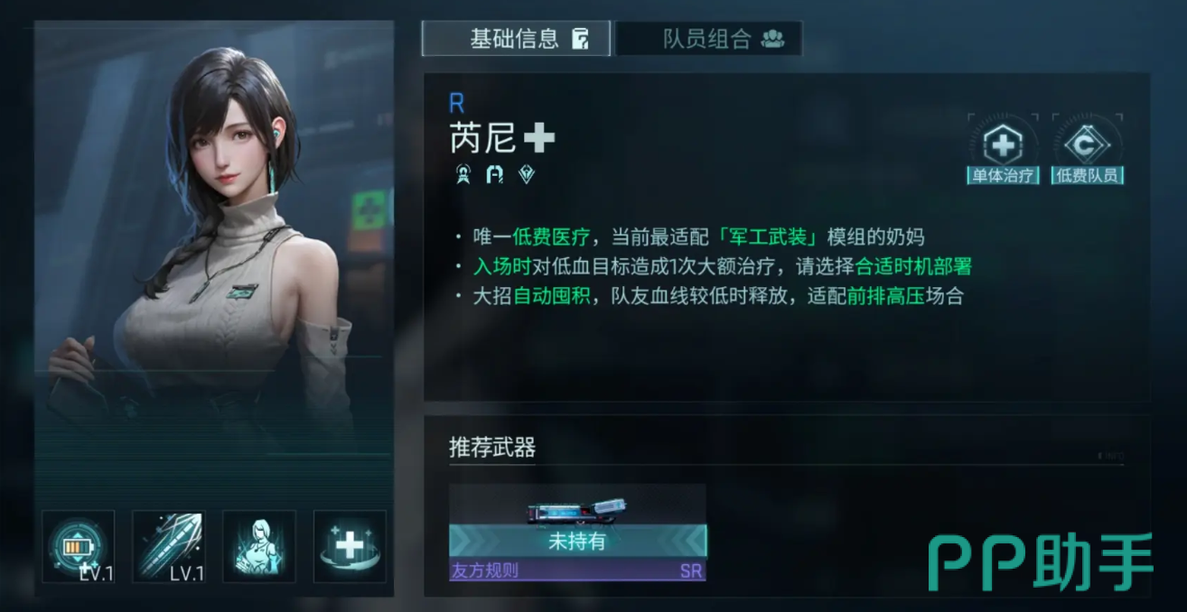 而且目前医疗角色相对来说用处比较多,不管是用作后勤保障也好,还是用作实战里面的支援也好,他们都是可以试用的,而目前大家要用这样类队员的话比较推荐的是橘子酱、芮尼、卡丽莎还有朝田这类角色,其中最推荐的是芮尼,芮尼虽然基础的品质不高,只有R级,但是她是游戏当中一个低费的医疗队员,而且还可以直接通过任务来获取,所以新手不费吹灰之力就可以拿到她,那么这里她在性价比上面也是最高的一位医疗队员,当前使用的环境非常多,芮尼如果上场的话是非常适配于军工武装这个模组的。