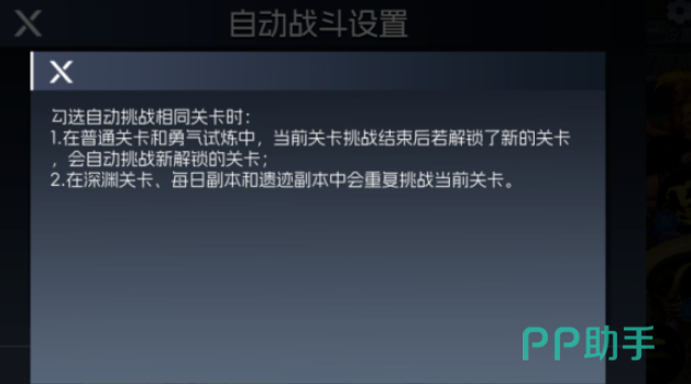 若勾选“复活币不足退出”,则当复活资源不足时,角色死亡后将自动离开当前关卡。此外,“自动挑战相同关卡”适用于深渊模式、每日副本与遗迹副本,可让角色重复刷取同一关卡以积累奖励。而在普通关卡或勇气试炼中,一旦解锁新章节,系统会自动推进至最新开放的关卡进行挑战。