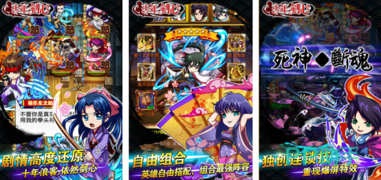 该手游依据浪客剑心动漫改编而成,采用Q版日漫美术风格,角色形象生动精致。目前已收录百余位武士角色,每位角色均具备独特的技能体系与优势特点。玩家可根据战斗需求自由搭配阵容,投入紧张刺激的对战之中。主线任务及剧情场景均紧密贴合原作设定,带来原汁原味的体验。
