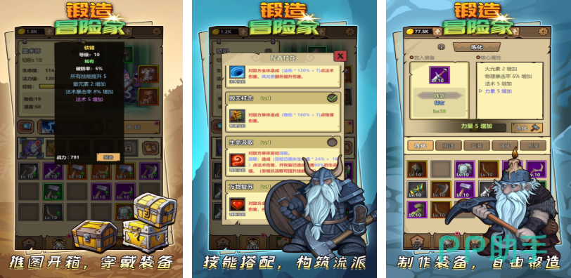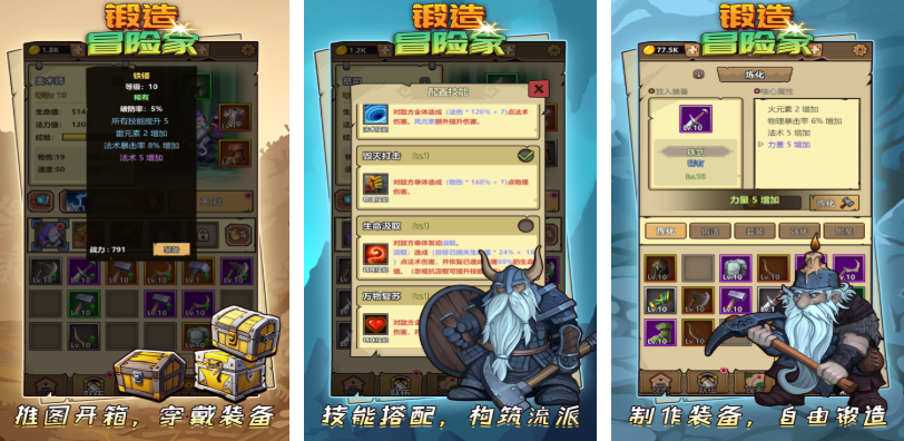 这里打铁锻造类的手游展现出休闲放置的主要玩法,职业搭配自由也有着超多装备可以锻造合成,而且角色技能搭配也很硬核塑造出的流派多种多样,构建队伍的特殊养成体系沉浸感自然不错,可使用各种配方对武器进行锻造升级,勇者主角可穿戴你打造的武器铠甲完成任务,独特的流派玩法带来的战斗性质更为爽快喲。