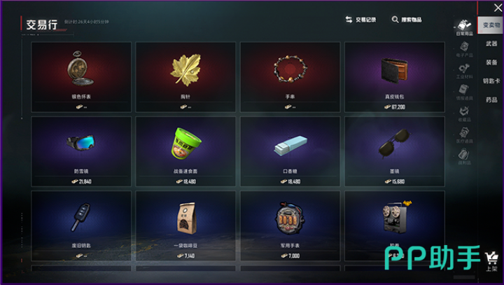 进入地铁大厅后,可在右下角找到交易行入口。进入界面后,可查看当前正在出售的各类物资,涵盖五个主要类别:变卖物、武器、装备、钥匙卡以及药品。玩家既可通过分类筛选查找目标物品,也可使用顶部搜索框快速定位所需内容。需要注意的是,购买的变卖物将会被绑定,无法再次上架交易。