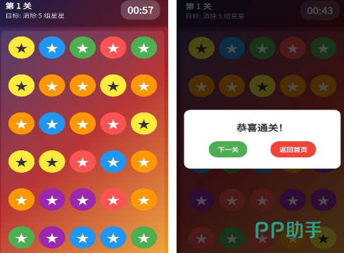 当大家进入了这款以消除玩法为主的游戏当中以后,可看到里面拥有着各种颜色的圆形,里面有着黑色或者是白色的五角星,主要的特点并不是说能达到每一个关卡要求的分数,而是根据关卡当中所提示的目标来完成消除的任务。比如在消除5组现象的时候,大家就需要合理的进行安排,通关以后就能进入下一个关卡。
