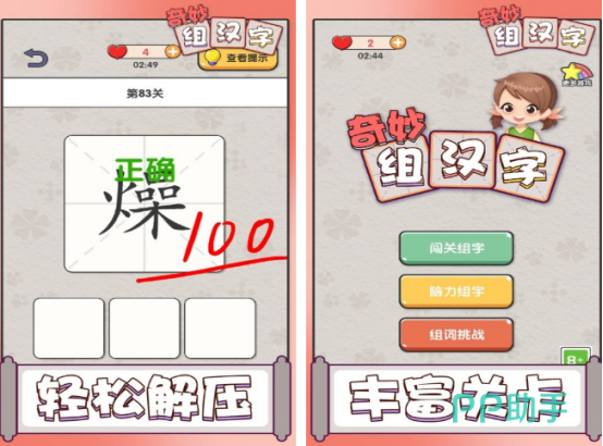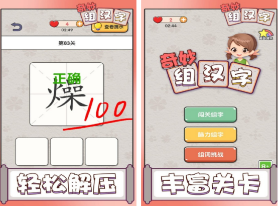 以现实生活中的偏旁部首,通过拼汉字的方式完成闯关的任务,可以让很多年龄段的孩子,通过这样的游戏了解我国的汉字,除此之外知道不同的偏旁部首结合在一起的情况下,也能有不一样的汉字呈现。作为适合各个年龄段玩家挑战,拥有丰富关卡的,不仅属于益智手游,也是玩法超级简单的,让你通过不断完成挑战以后,获得超高的成就。