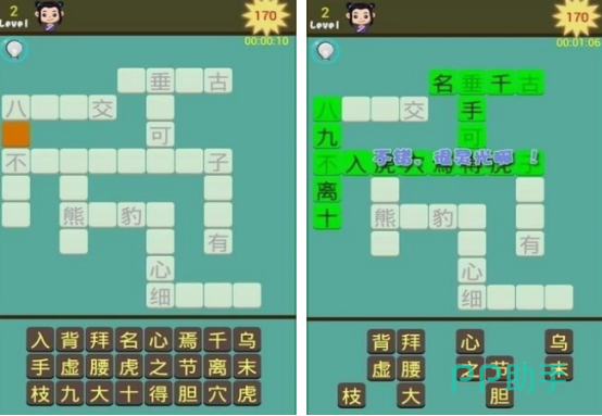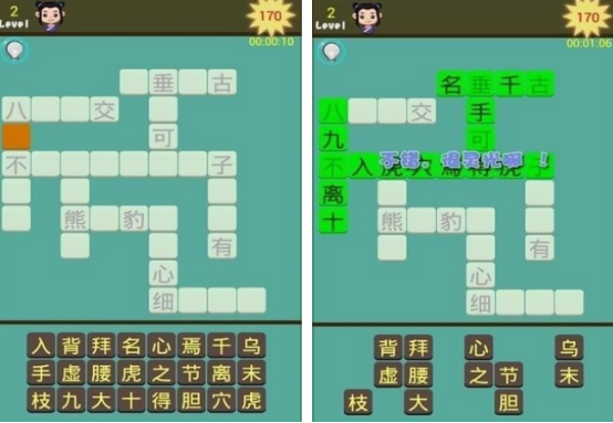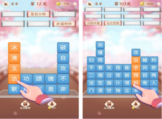 根据成语填空为主要玩法,你需要在每个不同的关卡布局当中,将提示的文字填写到方块里,如果横竖列的成语都是成立的情况下,就能顺利的过关,你也能让自己的称号不断的发生改变。有特别浓郁的古风画面,以及特别简单的玩法,不断的挑战自己的分数以后,也能让自己的成语积累量越来越高,也要有一定的能力和思维力。