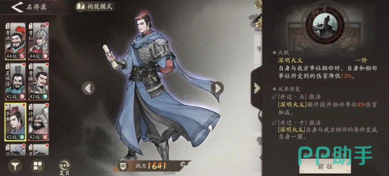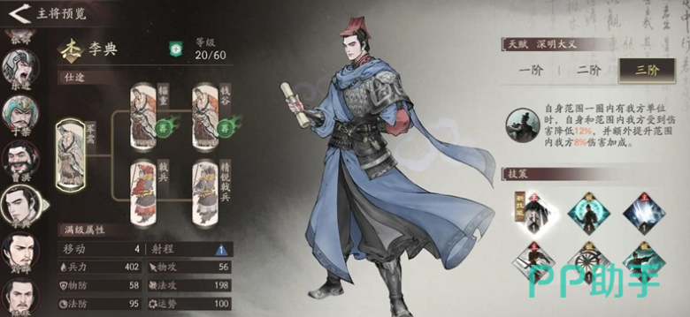 需要注意的是,李典本身不具备主动输出能力,战斗中高度依赖队友进行伤害输出。因此在加点策略上应避免走攻击路线,优先强化防御向技能。推荐升级顺序为:先满被动技能“持重少守御”,再提升主动技能,最后考虑觉醒技。该被动是李典的核心所在,升满后不仅自身防御提升15%,全队还能获得最高25%的减伤效果(满历练状态下),务必优先点满。