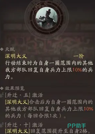 被动技能成型后,可将主动技能升至5级,随后视情况堆叠合击技能至5星即可停止投入。此技能可使队友对被嘲讽目标的伤害提升10%,属于增益类补充技能。对于资源紧张的平民玩家,建议将被动升至8级、主动升至5级后暂停培养,剩余资源优先供给主力输出武将,待后期再回头补足。