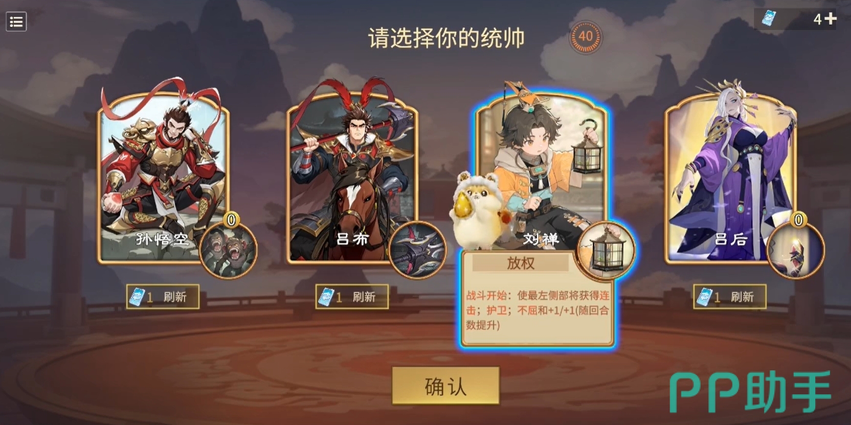 完成初始教学局后,玩家即可解锁八人同台竞技模式,与真实对手展开激烈对决。每场对局开始前,系统将提供四位统帅角色供选择,每位统帅都拥有独特的统帅技,触发条件和效果各不相同。对于尚不熟悉机制的新手而言,建议优先选用操作简单、适用范围广且兼容性强的统帅,如曹操、刘备等,有助于更快掌握游戏核心节奏。进入对战阶段后,玩家可通过商店购置心仪的部将组建阵容,但需注意:只有部署在战场上的部将才会参与战斗,切勿将已购买的角色长期滞留在手中未上阵。