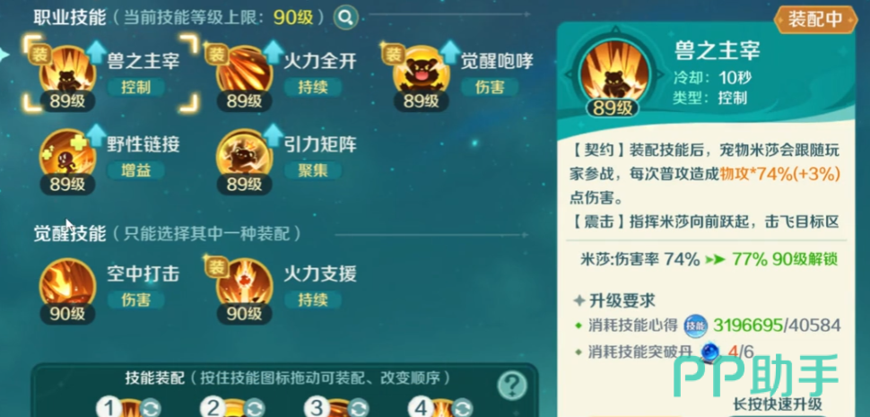 首先是PVP和PVE当中其实对于猎魔人的玩法大家是要完全分开的,PVE这里可以点的是兽之主宰,火力全开,觉醒咆哮这几个技能,其中的兽之主宰,主要是带来【契约】的装配效果,这个技能使用技能后,其中召唤来的宠物米莎就会跟随玩家一起参战,其中的每次普攻造成物攻的74%(+3%)点伤害数值,然后如果指挥米莎向前跃起,还可以击飞目标区当中的敌人,这个效果就是【震击】的效果,这里米莎的伤害率就是74%的数值,后期可以在90级的时候解锁77%这个数值。