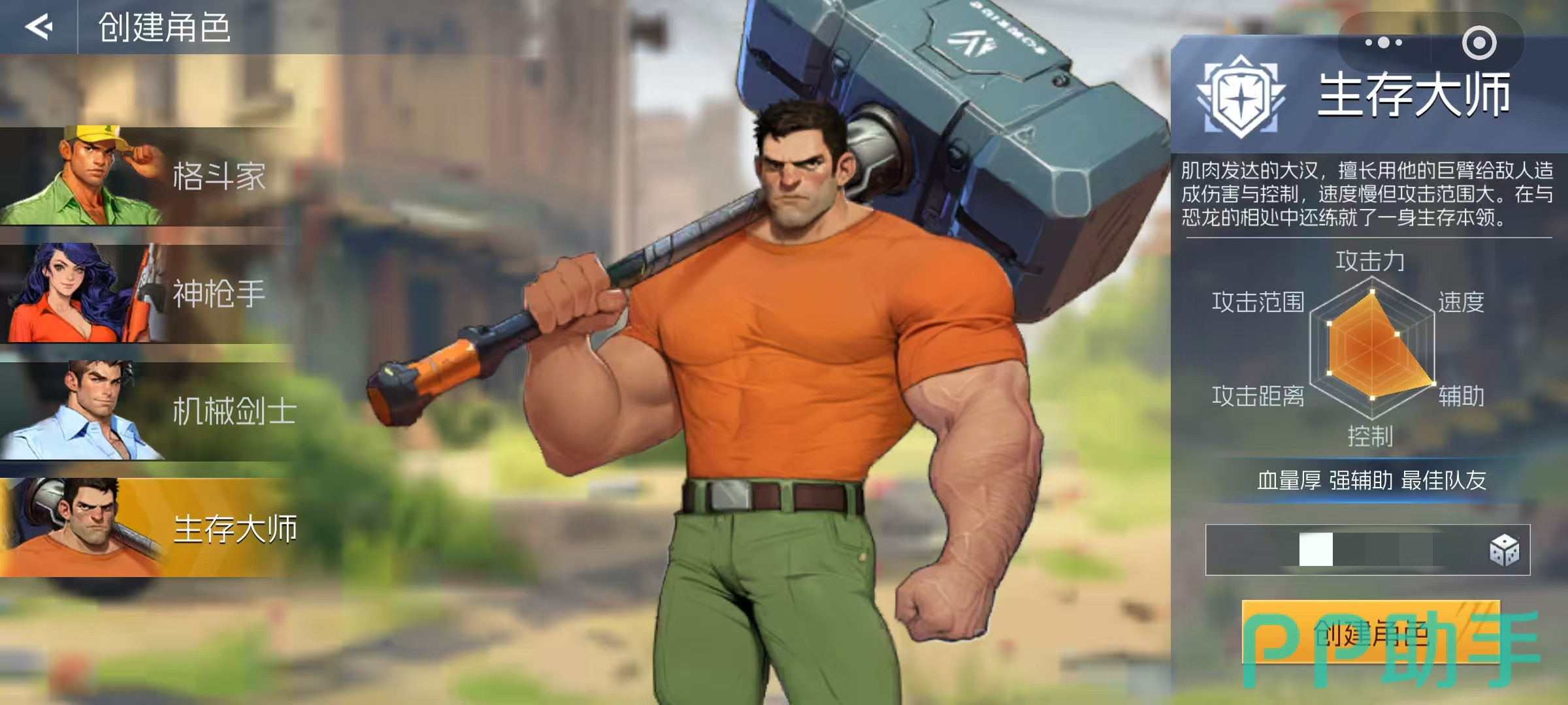 属性配置方面,生存大师的生命值与辅助属性达到满配水平,攻击力同样处于高位,攻击范围广阔,唯一短板是移动与攻击速度被设定为最低档,这也与其“重装战士”的定位相符。综合来看,他是一个高耐久、强支援的职业,在组队模式中能承担起核心前排的角色。但由于操作节奏较慢,需要玩家精准掌握技能释放时机与走位策略,才能有效规避机动性不足的问题。
