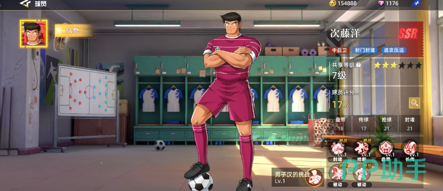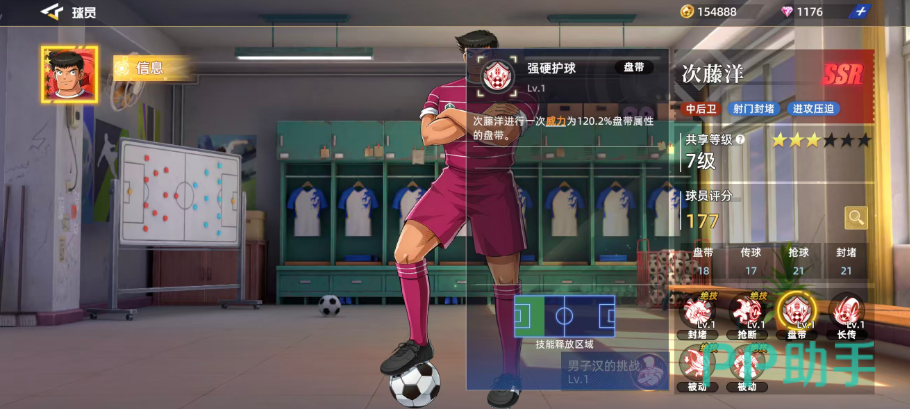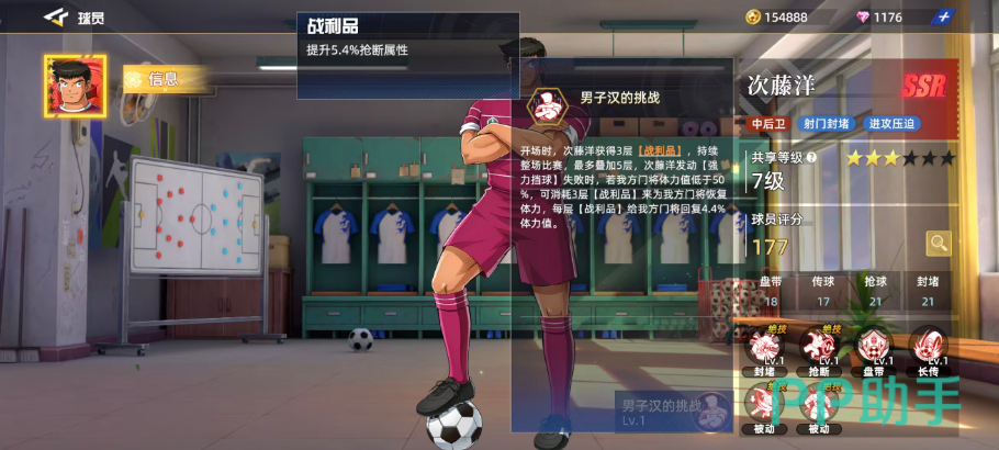“强力压迫”技能可在自身封堵属性基础上增加2.8%,并且当次藤洋释放“强力挡球”且对手控制值低于509时,额外提升5.7%的封堵威力,形成针对性压制。而“男子汉的挑战”则是一项极具战略价值的开场技能:比赛开始即为次藤洋叠加3层【战利品】状态,此状态可持续整场,并在累计至5层时提供更高增益。若“强力挡球”释放失败且我方门将体力低于5%,次藤洋可消耗3层【战利品】,每层恢复门将4.4%体力,实现关键时刻的救险支援。