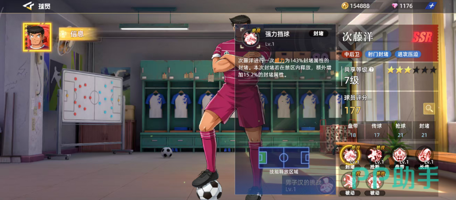 在技能配置方面,次藤洋的核心防守技能“强力挡球”具备143%封堵属性的威力基础值。若该技能在禁区内释放,则额外获得15.2%的封堵属性加成,极大提升了他在禁区内的防守威慑力。另一主动技能“强力冲撞”则拥有143%抢断属性的威力,并可在成功执行后降低对方3.8%的盘带能力,有效削弱对手持球突破的威胁。