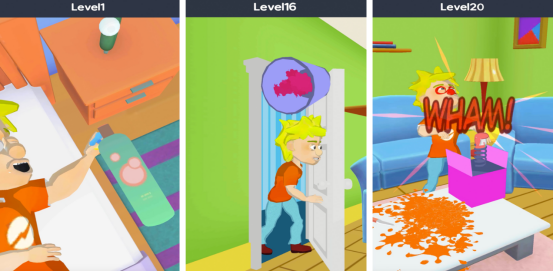 拥有大量关卡设计,专为释放压力而打造。玩法围绕整蛊展开,例如在门上放置水桶,当他人推门时便会淋个满头;或是设置错误电路,让角色在修理灯具时触电抽搐,伴随夸张音效令人捧腹。每一个机关都充满创意,带来持续不断的笑声。